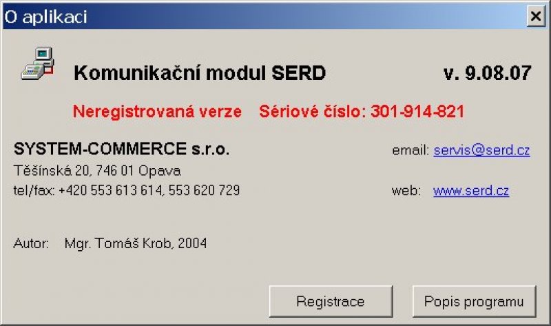 Program SERD Modul, je určen pro naše obchodní partnery, dealery a koncové zákazníky. Zahrnuje snadnou komunikaci pokladen s libovolnou aplikací. Za pomoci tohoto programu lze dávkově (pomocí parametrů) převést data z pokladny do textového tvaru, a s nimi potom dále pracovat např. ve skladovém hospodářství apod. Daný textový soubor pak obsahuje informace dle předchozího parametru, např. o PLU, zbožních skupinách včetně stavů skladu, který si pokladna sama eviduje, atd.. Lze jej samozřejmě použít pro přenosy dat z počítače (t.j. z textových souborů) do pokladny. Modul ja dostupný také jako knihovna DLL se všemi funkčními vlastnostmi. SERD modul je univerzální pro uvedené modely.